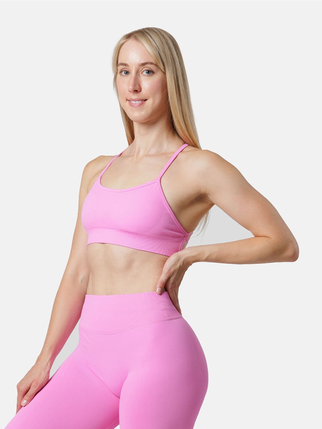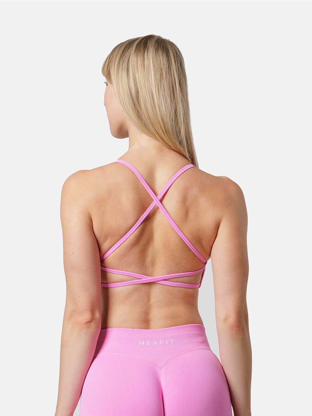 Růžová sportovní podprsenka s jemným stínováním podtrhne krásu dekoltu a okouzlí ladným překřížením ramínek na zádech.